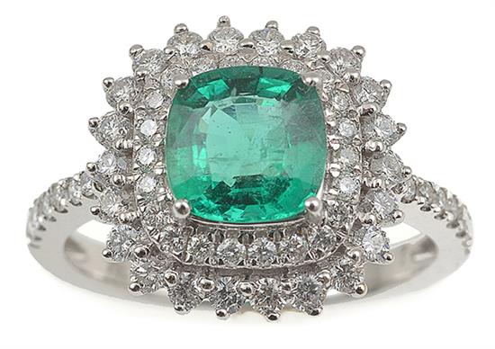 The cushion cut emerald of 1.15cts, surrounded by round brilliant cut diamonds totalling 0.63cts, mounted in 18ct white gold, ring size K.