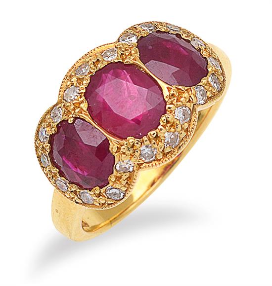 Set with three oval cut rubies totalling 3.37cts, surrounded by single cut diamonds, mounted in 18ct gold, ring size L.