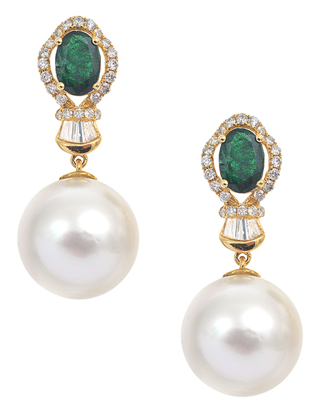 A PAIR OF PEARL, EMERALD AND DIAMOND DROP EARRINGS