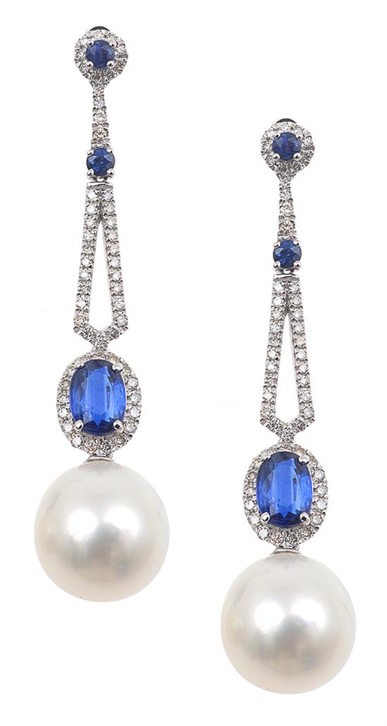 A PAIR OF SOUTH SEA PEARL AND SAPPHIRE EARRINGS
