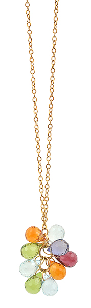 Featuring briolette cut citrine, garnet, peridot, aquamarine and iolite, suspended from a trace chain, all mounted in 18ct gold, signed, total length 420mm, boxed.