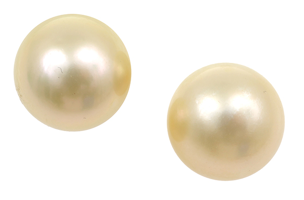 Each set with a round pearl of pale gold hue measuring 14.60mm, offset with a round cultured pearl of pink cream hue measuring 6.40mm, mounted in 18ct gold.