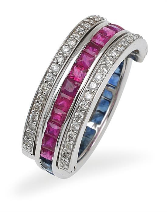 Featuring a band of carre cut rubies and the other half sapphires, flanked by two rotating half bands of round brilliant cut diamonds, mounted in 18ct white gold, ring size O.