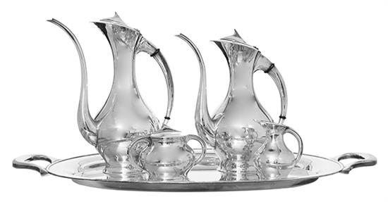 Of Atomic design and baluster form with elongated tapered spouts and handles, total weight 4,385 grams, tallest 29cm.