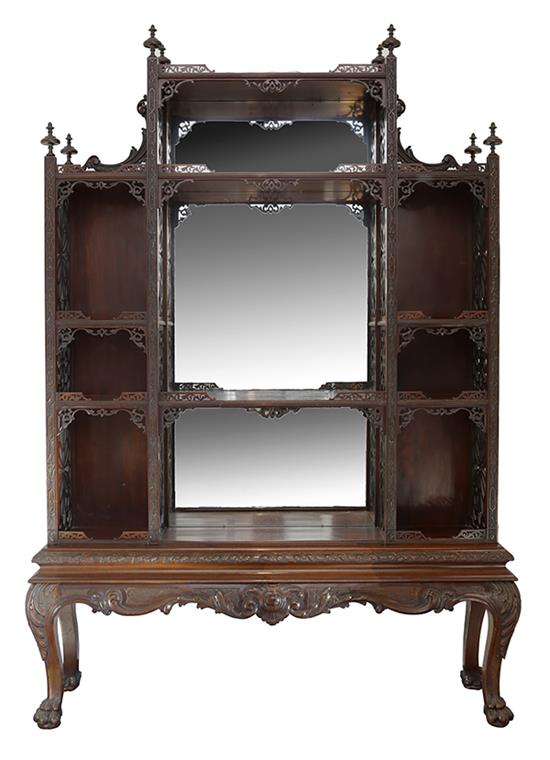 With mirror plated back, the open sectional shelves with fretted carved sides and galleries, with shaped base frieze and moulded cabriole leg with lion paw feet, 128cm width x 35cm depth x 188cm height.