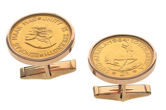 Each set with a South African two rand gold coin, mounted in gold frame.