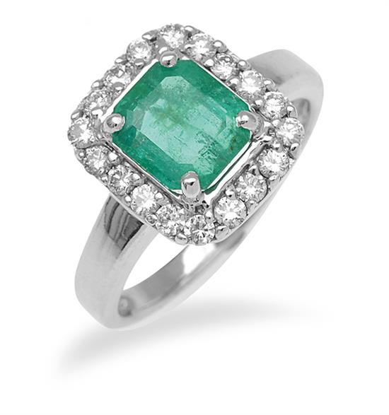 Centrally set with an emerald cut emerald of 1.96cts, surrounded by round brilliant cut diamonds, mounted in 18ct white gold, ring size L-M.