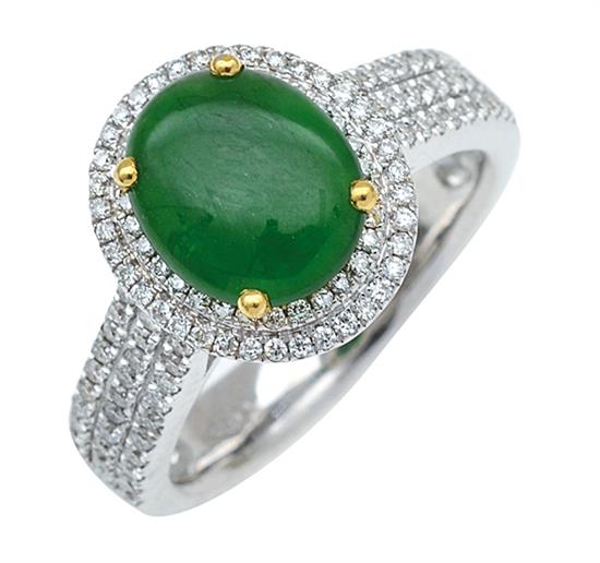Featuring an oval jadeite cut en cabochon of 1.70cts, surrounded by round brilliant cut diamonds, mounted in 18ct white gold, ring size L.