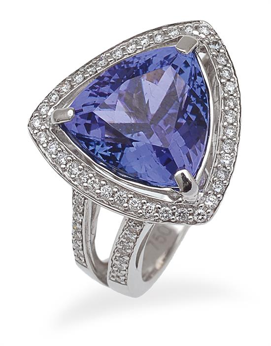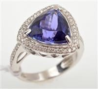 The trilliant cut tanzanite of 5.90cts, surrounded by round brilliant cut diamonds, mounted in 18ct white gold, ring size M.