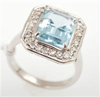 The octagonal plaque set with an emerald cut aquamarine of 5.10cts surrounded by round brilliant cut diamonds, mounted in 18ct white gold, ring size O.