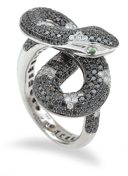 A BLACK AND WHITE DIAMOND SNAKE RING