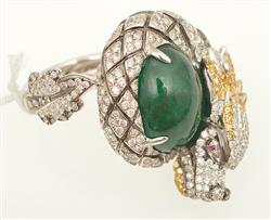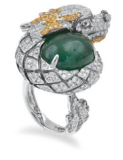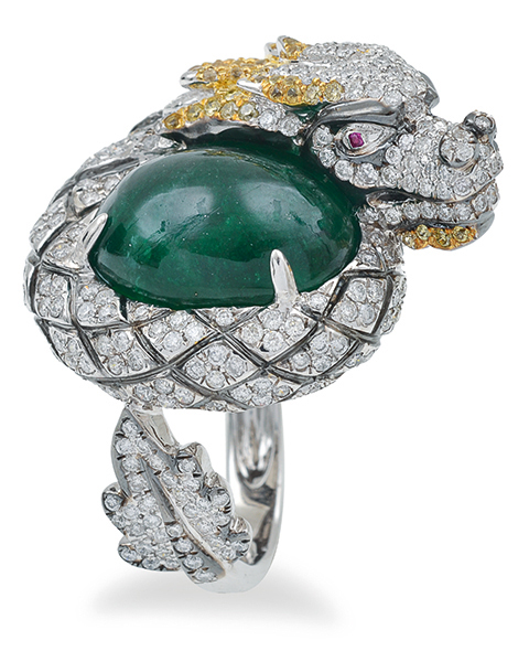 Modelled as a dragon curled around an oval emerald cut en cabochon of 14.38cts, set throughout with round brilliant cut diamonds totalling 2.29cts and yellow sapphires totalling 0.42cts, mounted in 18ct white gold, ring size P.