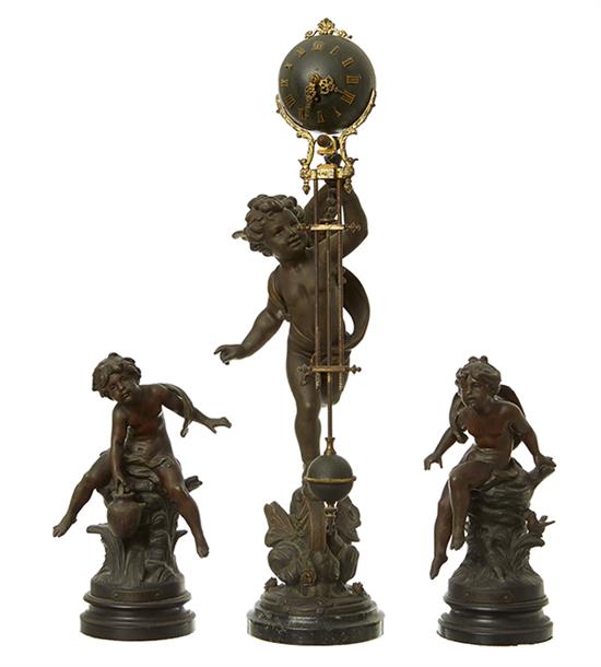 Modelled as cupid holding aloft a swinging pendulum clock, with two putto spelter figures 'La Source' and 'La Foret', 57cm and 25cm high, (3).