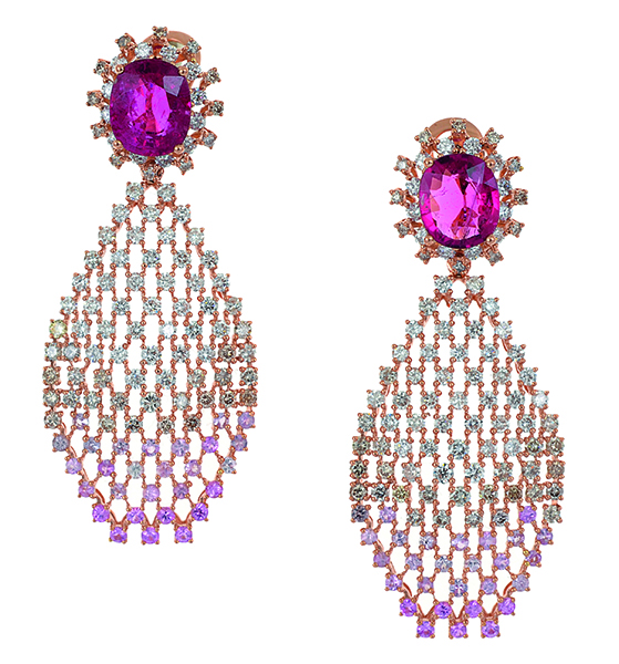 Each set with an oval cut rubellite of 2.14cts, surrounded by diamonds and having a pierced panel set below with pink sapphires in graduated hues and further diamonds, mounted in 18ct rose gold.