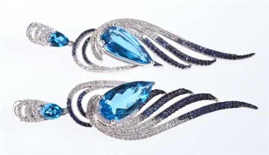 Each of stylised feather design set with a pear cut blue topaz, offset by round diamonds and blue sapphires, having surmounts of conforming design, mounted in 18ct white gold.