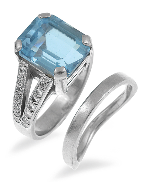 The emerald cut aquamarine with deep blue saturation of 4.38cts, having diamond set split shoulders, together with a fitted wedder, all mounted in 18ct white gold, ring size H.