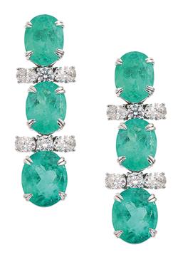 Each set with three oval cut emeralds totalling 12.08cts, interspaced with two trefoils of oval and round brilliant cut diamonds totalling 1.47cts, mounted in 18ct white gold.