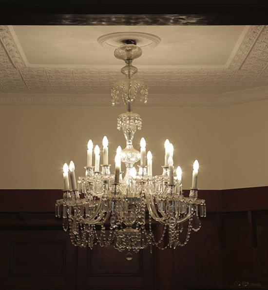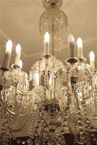 The long sectional stem with bowl supporting the sixteen branches with fluted stems in two layers terminating in thumb and star cut bobeche with faceted and plaque shaped drops. Reputedly originally decommissioned from the Old Railway Hotel at Central Station Sydney.