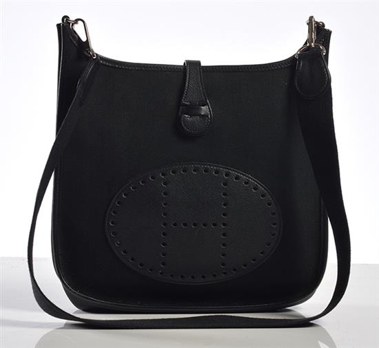 Styled in black calf leather and canvas, with silver metal hardware, 29 x 27 x 7cm.