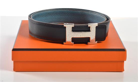 The reversible blue and black leather belt, with silver metal buckle, total length 104cm, with box.