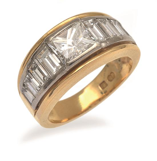 The princess cut diamond of 1.60cts, shouldered by graduated baguette cut diamonds, mounted in 18ct gold, ring size L-M.