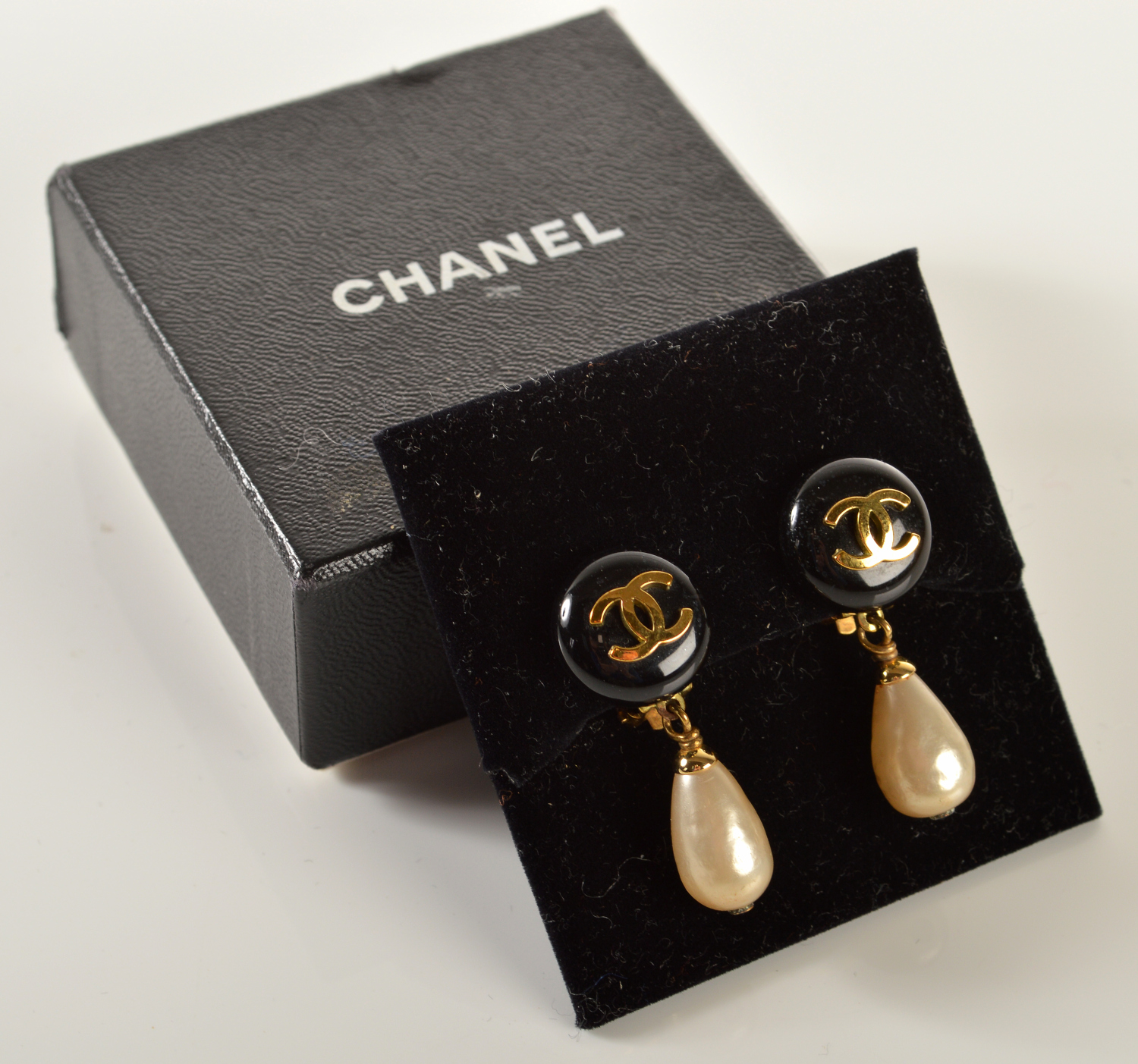 Each black clip on earring with 'CC' motif and faux pearl drop, stamped 1994, with box.