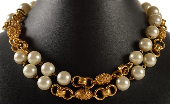 Styled with faux pearls to gold metal links and chain, with box.