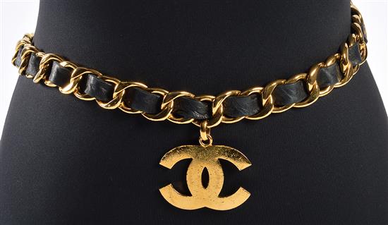 The interwoven black leather and gold metal chain and central CC pendant, total length 90cm.