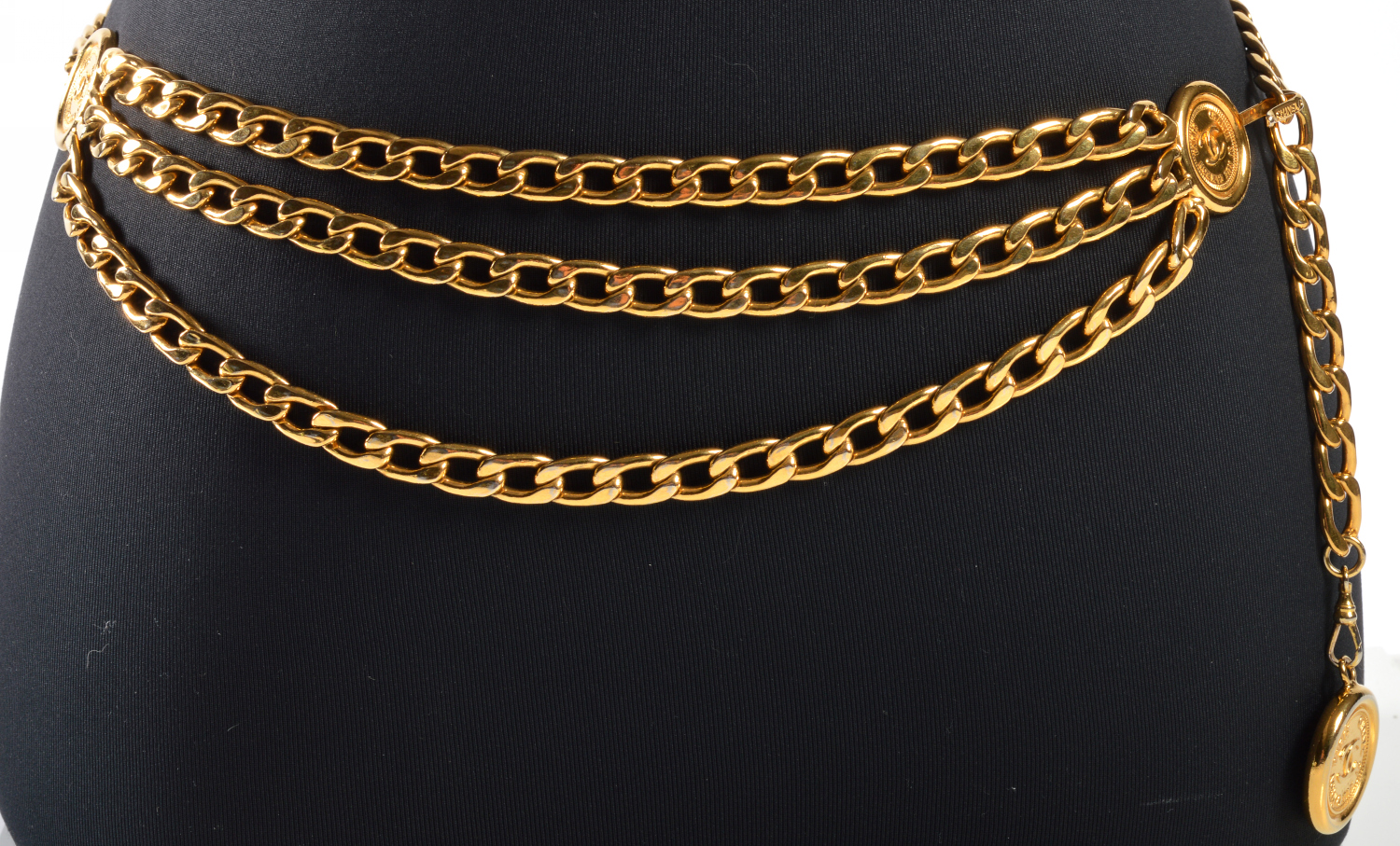 The gold metal chain, with 'CC' medallions, total length 94cm, with box.
