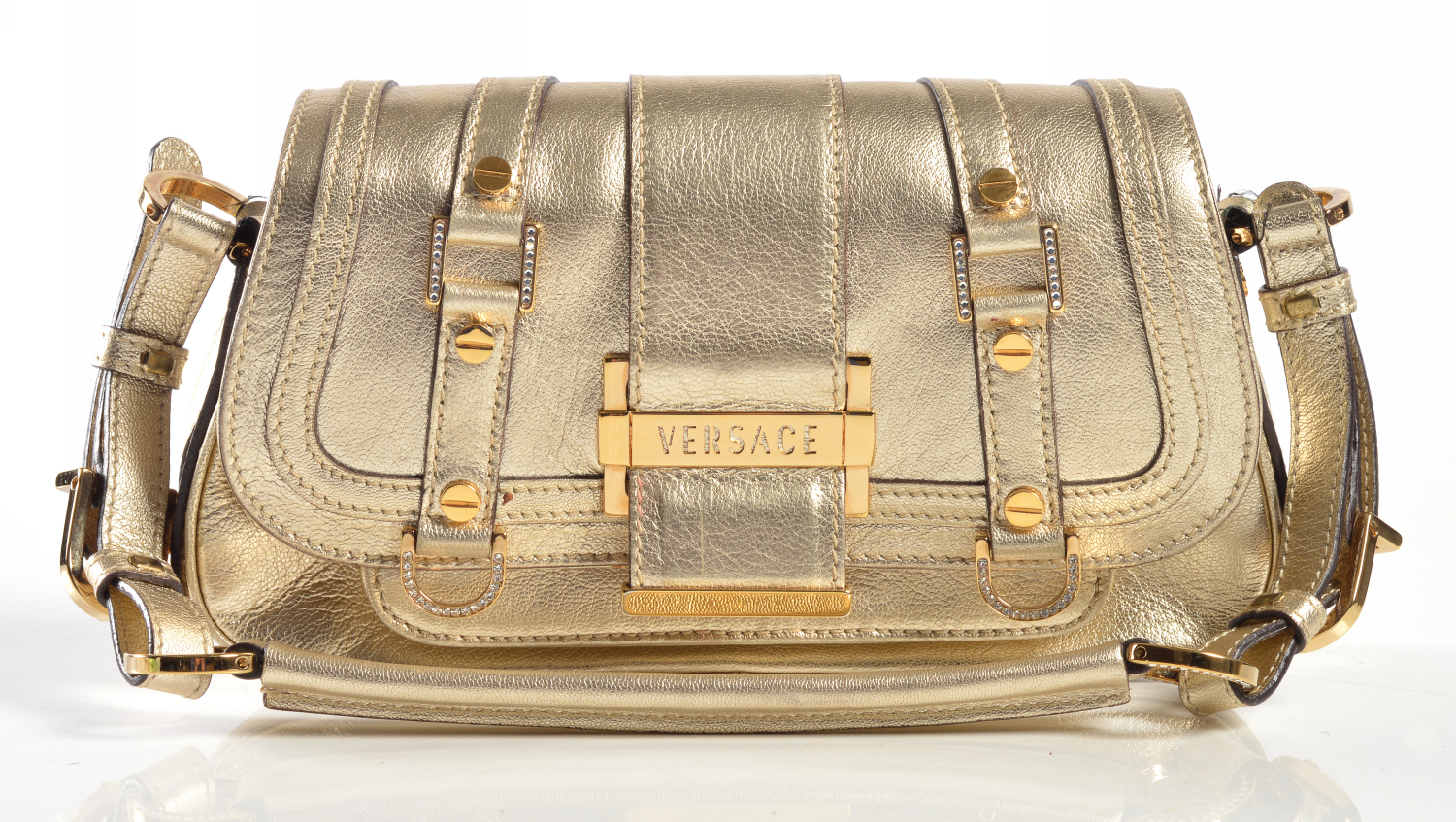 Styled in gold leather, with gold metal hardware and diamante detail, 22 x 12cm.