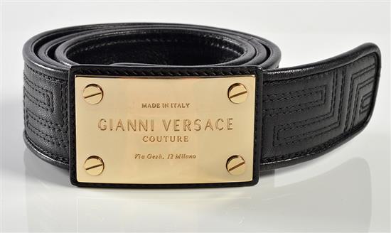 Styled in black leather, with gold metal buckle, total length 97cm.