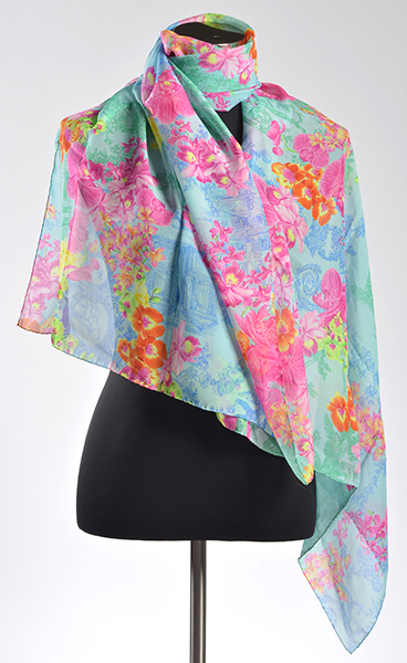 The sheer scarf styled with a floral theme in multi colours, on an aqua background, 174 x 66cm.