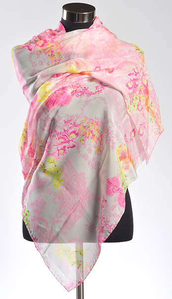 The sheer scarf styled with a floral theme in tones of orange and pink, 174 x 66cm.
