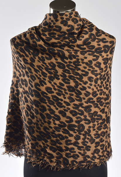 Styled in cashmere and silk scarf styled with a leopard print pattern in tones of brown, with a pink Louis Vuitton motif, 130 x 180cm.