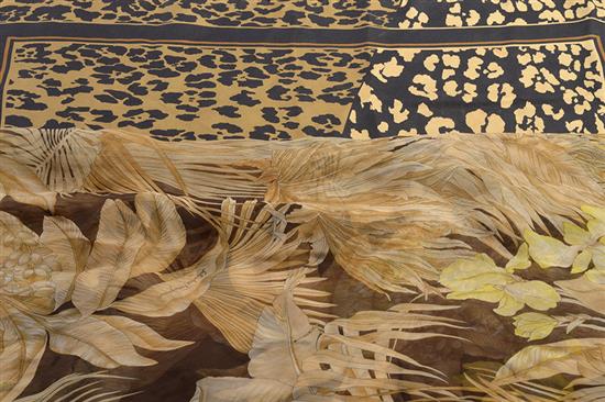 Styled with a leopard print design in colours of cream and black, 68cm square, together with a sheer scarf with a floral theme in tones of brown, 172 x 68cm.