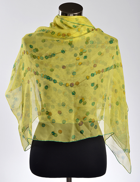 The sheer scarf with bead pattern in colours of green and blue, on a lemon background, 176 x 64cm