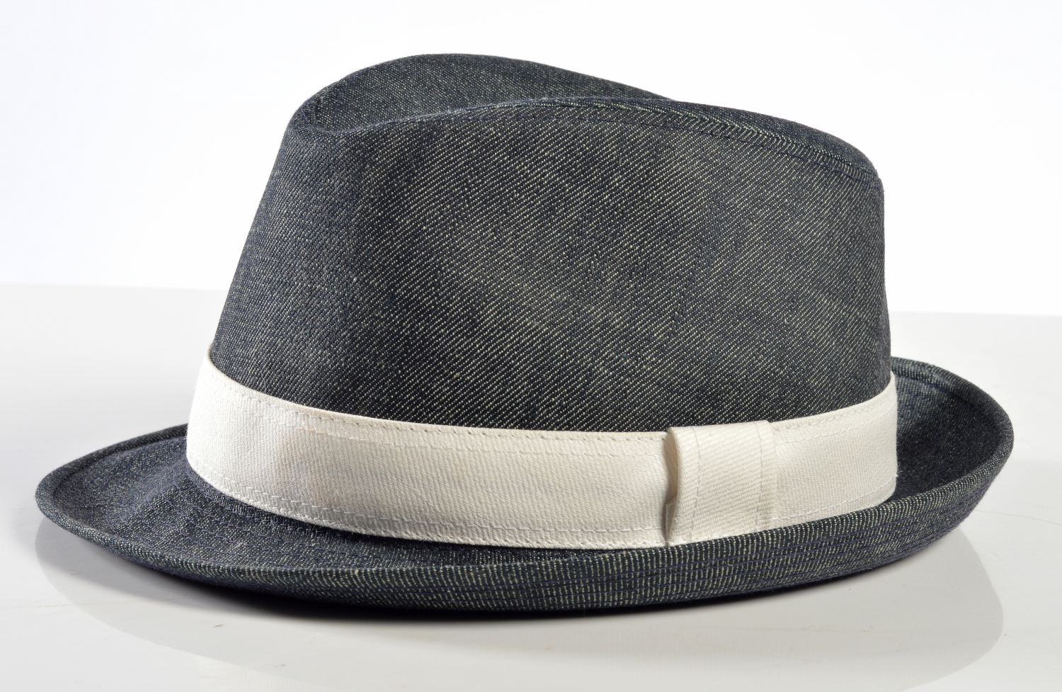 Styled in grey cotton and linen, with white band, labelled size 57.