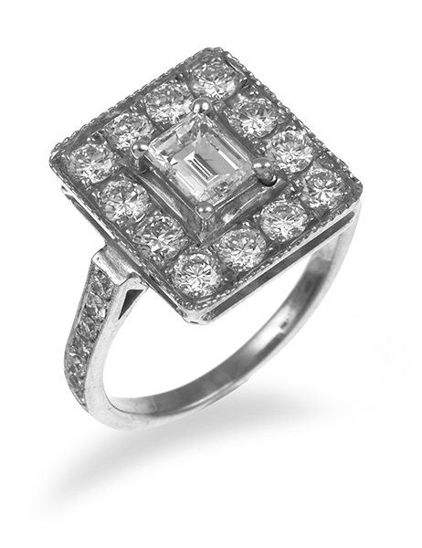 Centrally set with an emerald cut diamond of 1.00cts, surrounded by round brilliant cut diamonds totalling 1.08cts, mounted in 18ct white gold, ring size P.