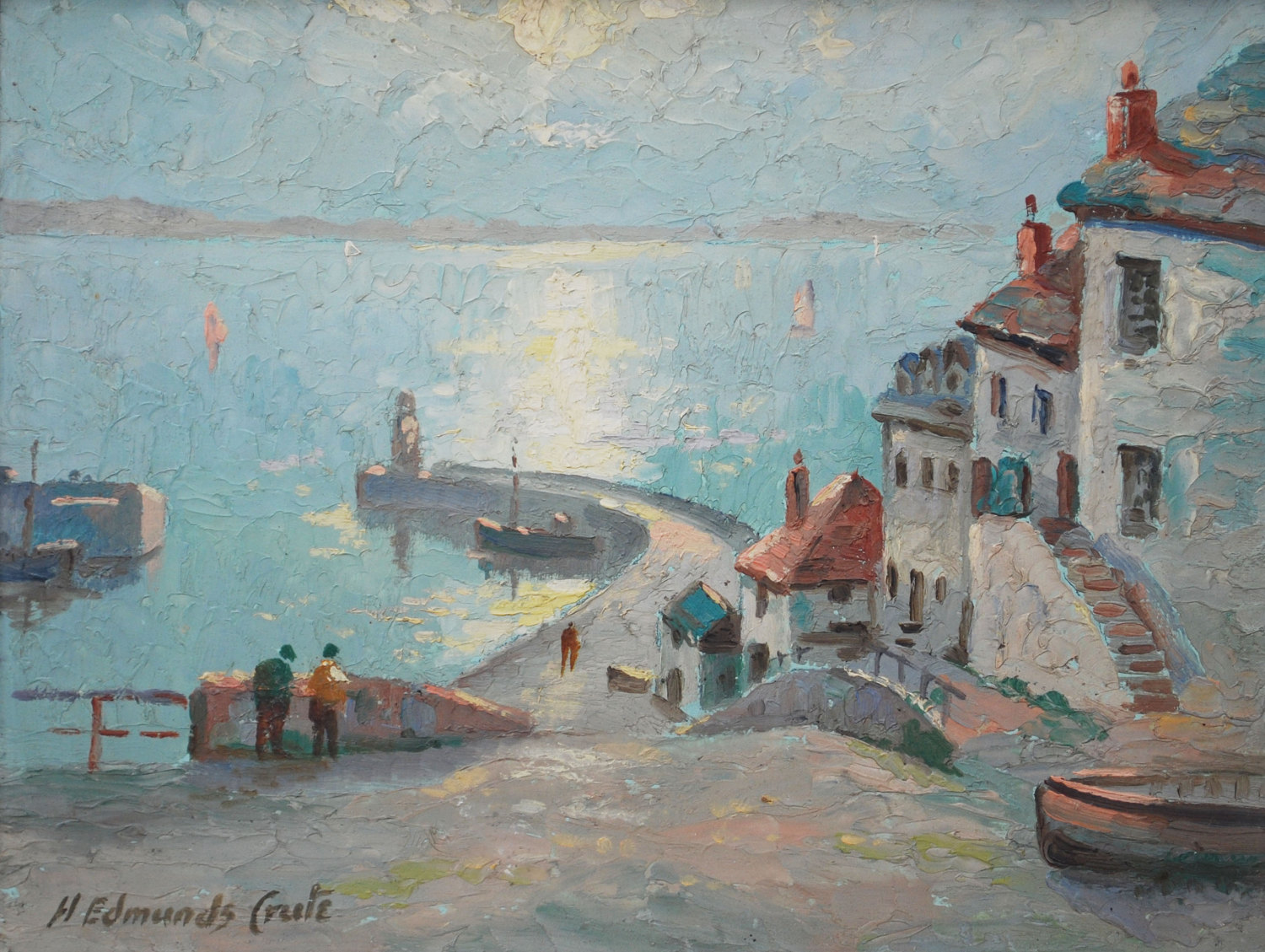 HARRY EDMUNDS CRUTE (BRITISH 1888-1975), EUROPEAN WATERSIDE VILLAGE, OIL ON BOARD, 22 X 28CM
