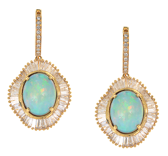 Of ballerina design, each set with an oval solid white opal cut en cabochon, surrounded by baguette cut diamonds totalling 1.13cts, suspended from a diamond set hoop, all mounted in 18ct gold.