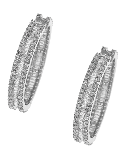 Each set with a row of baguette cut diamonds totalling 0.80cts, flanked by two rows of round brilliant cut diamonds totalling 1.14cts, mounted in 18ct white gold.