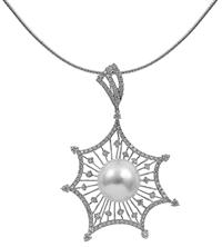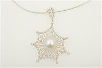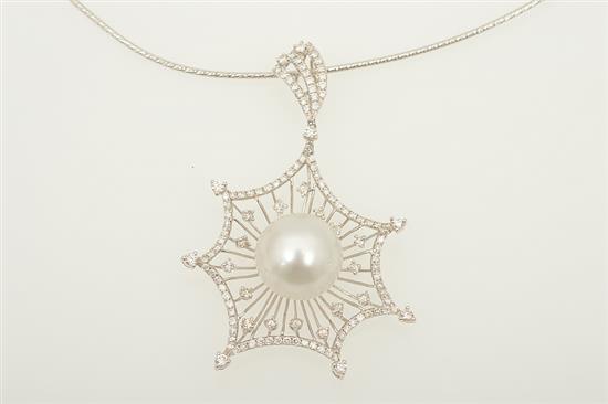 The round pearl of silver white hue measuring 14.20mm, centrally set to a pierced star shaped frame set with round brilliant cut diamonds, suspended from a cable chain, all in 18ct white gold.