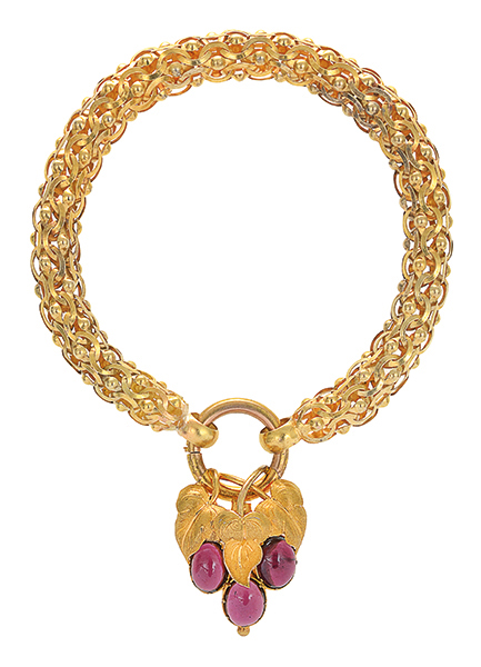 The pierced fancy link hollow bracelet set in 18ct gold having a grape and vine leaf clasp set with three garnets cut en cabochon in 15ct gold, total length 200mm.