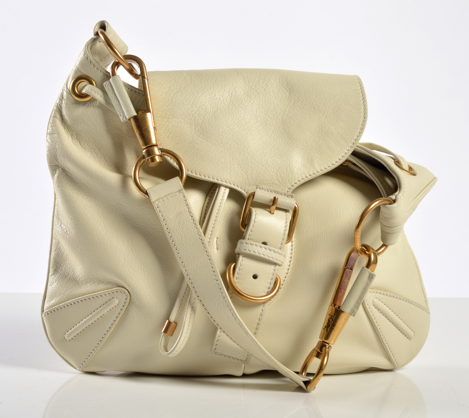 Styled in cream leather, with gold metal hardware, 30 x 26cm.