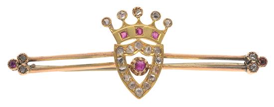 Featuring a shield and crown set with old mine cut diamonds and garnets, with applied signature, mounted in 15ct gold.
