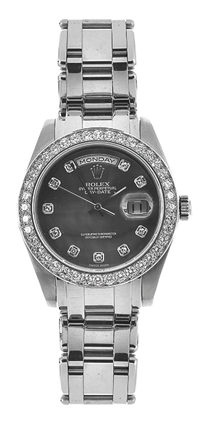 Automatic movement, circular mother of pearl dial with diamond numerals, day aperture at twelve and date aperture at three, signed case, dial and movement, platinum case with diamond set bezel and platinum case and conforming platinum bracelet bands, reference 18946, serial number P197991, 40mm diameter.