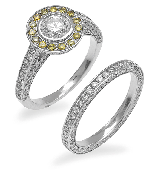 Centrally set with a round brilliant cut diamond of 0.80cts, surrounded by a halo of yellow diamonds, and having white diamonds set to the shoulders and to a matching eternity band, all mounted in platinum, ring size M-N.
