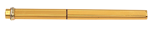 To a gold plated case with applied trilogy decoration, signed Cartier.