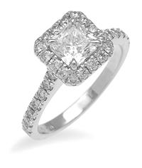The radiant cut diamond of 1.24cts, surrounded by round brilliant cut diamonds totalling 0.72cts, mounted in 18ct white gold, ring size O, with GIA laser inscription and accompanied by GIA report stating colour D, clarity VS2, boxed.