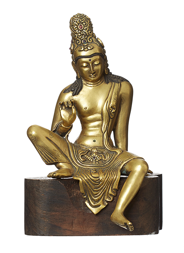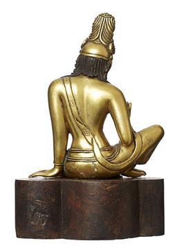 In reclining pose and seated on a wooden plinth, inlaid with semi precious stones. 21.5cm high.
